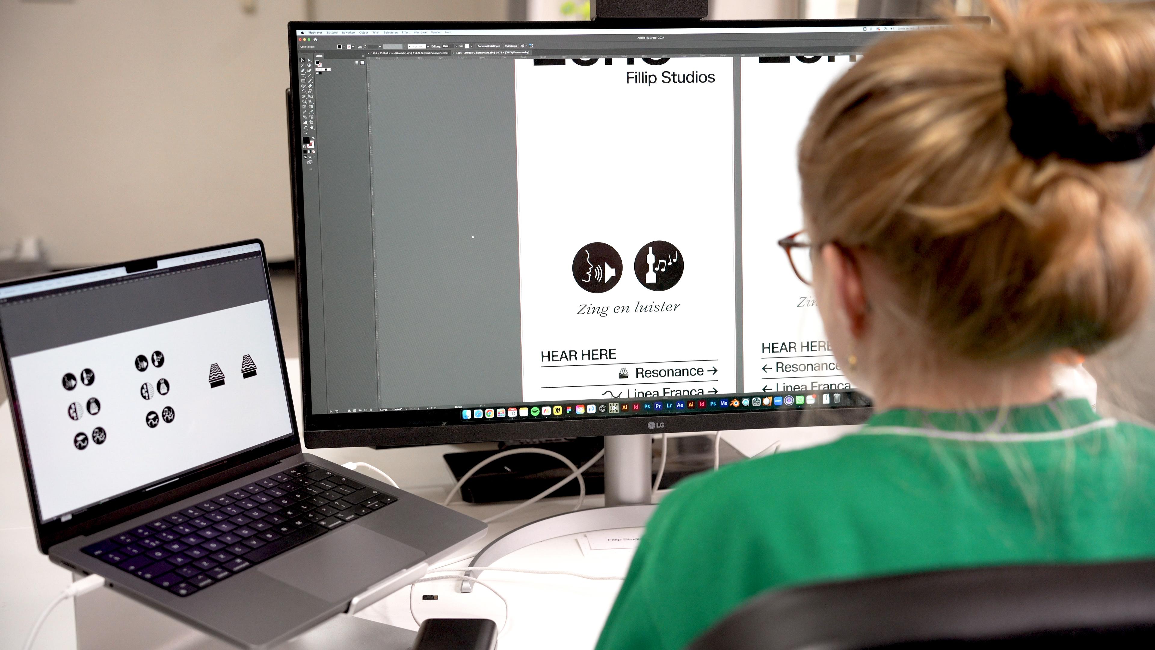 "I'm a graphic designer at Fillip Studios," Jonne introduces herself. "This is my workspace where I make all the graphic designs or edit the photography or the videos for everything that we make." However, her role is much more than creating beautiful images; it's a crucial layer that defines the total experience. The central question in her work is therefore fundamental to the studio: how do you translate the soul of an interactive artwork into a clear, inviting guide?